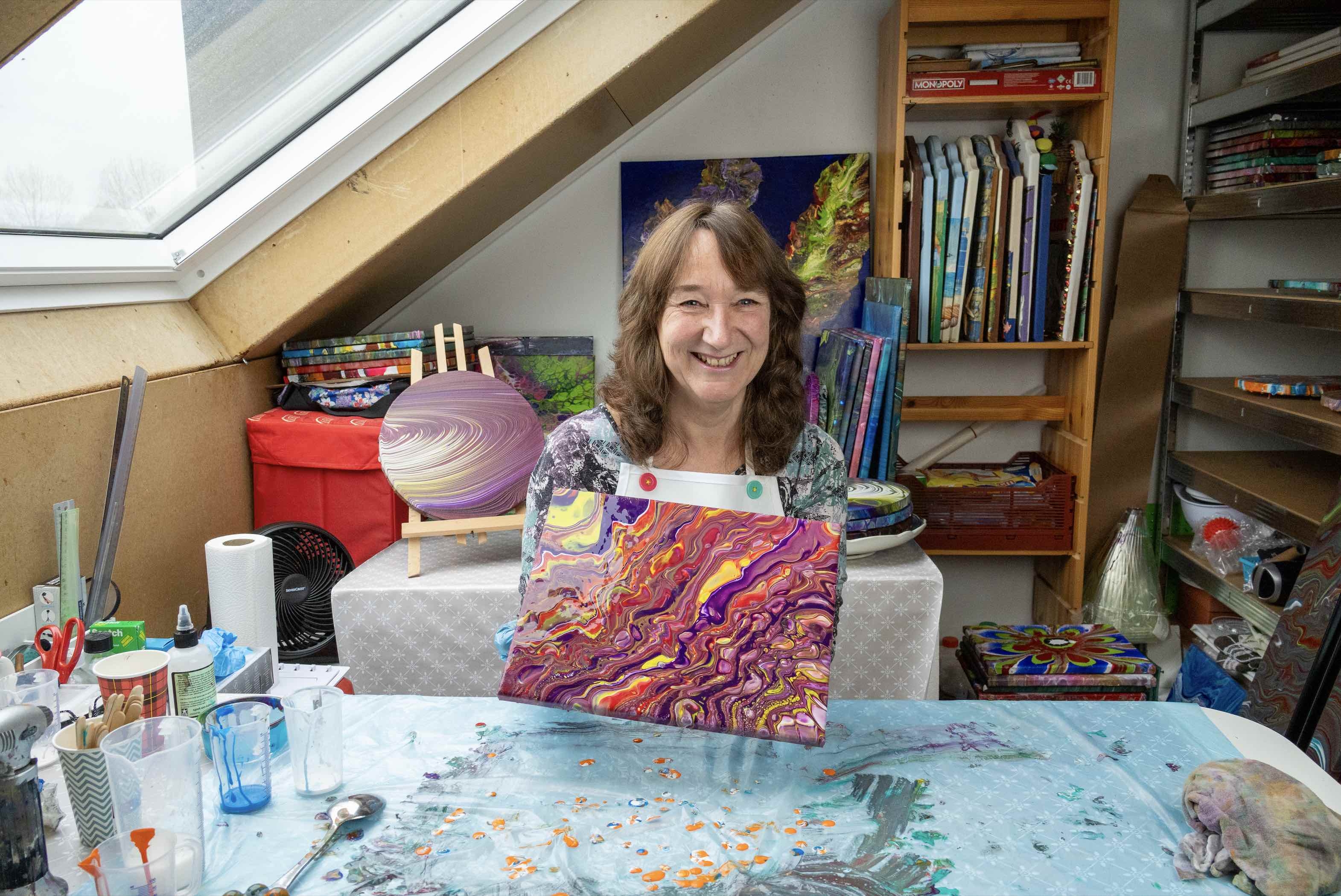Je leert hoe je acrylverf en pouring medium tot een goede mix roert, hoe je de cirkel verhoogt met punaises en hoe je in kleine cirkels giet om een helder ringpatroon op te bouwen. Aglaé laat je ook zien hoe je de verf mooi over het hout laat lopen, hoe je luchtbelletjes verwijdert en hoe je kleine oneffenheden corrigeert terwijl je bezig bent.